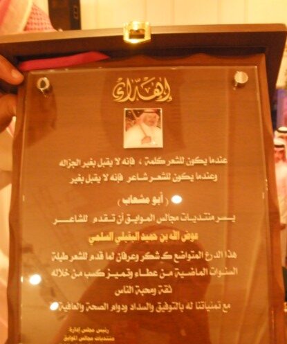 25 نوفمبر، 2025 أرشيف مجالس الموايق مجالس الموايق تشارك بتقديم هدية تذكارية في حفل اعتزال الشاعر ابو مشعاب – رحمه الله